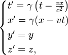 Voorbeeld: Er zijn twee stelsels, die met een snelheid v in de x-richting ten opzichte van elkaar bewegen. Tijd t en positiecoördinaten x, y, z worden door een waarnemer die met snelheid v beweegt als volgt gemeten als t' en x',y',z':